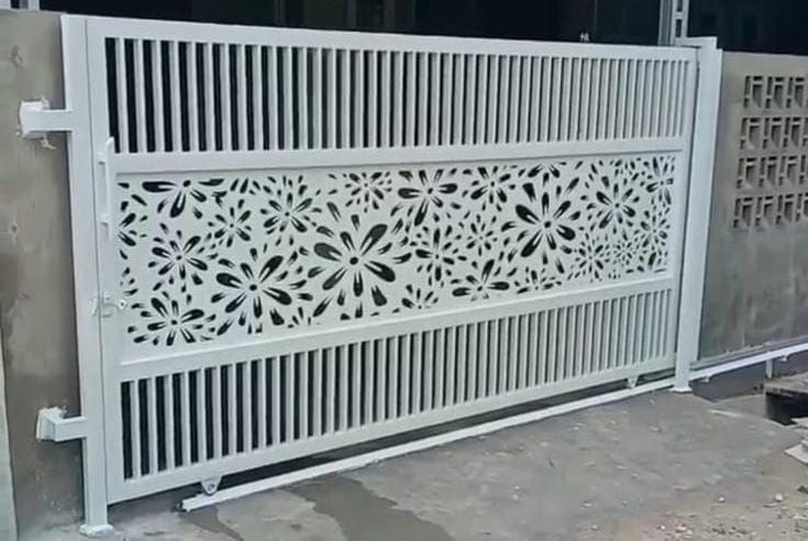 Pintu besi cutting dengan desain motif bunga elegan ini cocok untuk rumah modern yang ingin tampil lebih mewah dan unik.